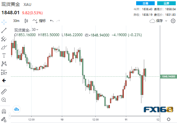 (现货黄金30分钟走势图,来源:FX168)