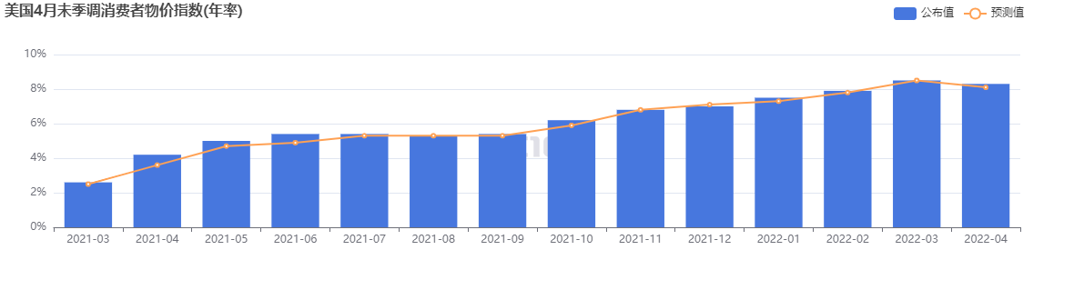 衡量商品和服务价格的消费者价格指数(CPI)较上年同期上涨8.3%,高于道琼斯预计的8.1%的涨幅。这比3月份的峰值略有缓和,但仍接近1982年夏季以来的最高水平。