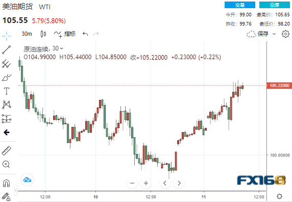 WTI原油日内暴涨约6%,最高触及105.65美元/桶。布伦特原油日内大涨5.00%,现报106.69美元/桶。