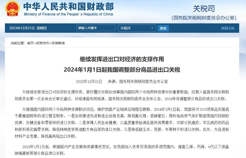 据财政部网站消息,为继续发挥进出口对经济的支撑作用,更好履行关税在统筹国内国际两个市场两种资源中的重要职能,12月21日,国务院关税税则委员会发布公告,2024年将调整部分商品的进出口关税。