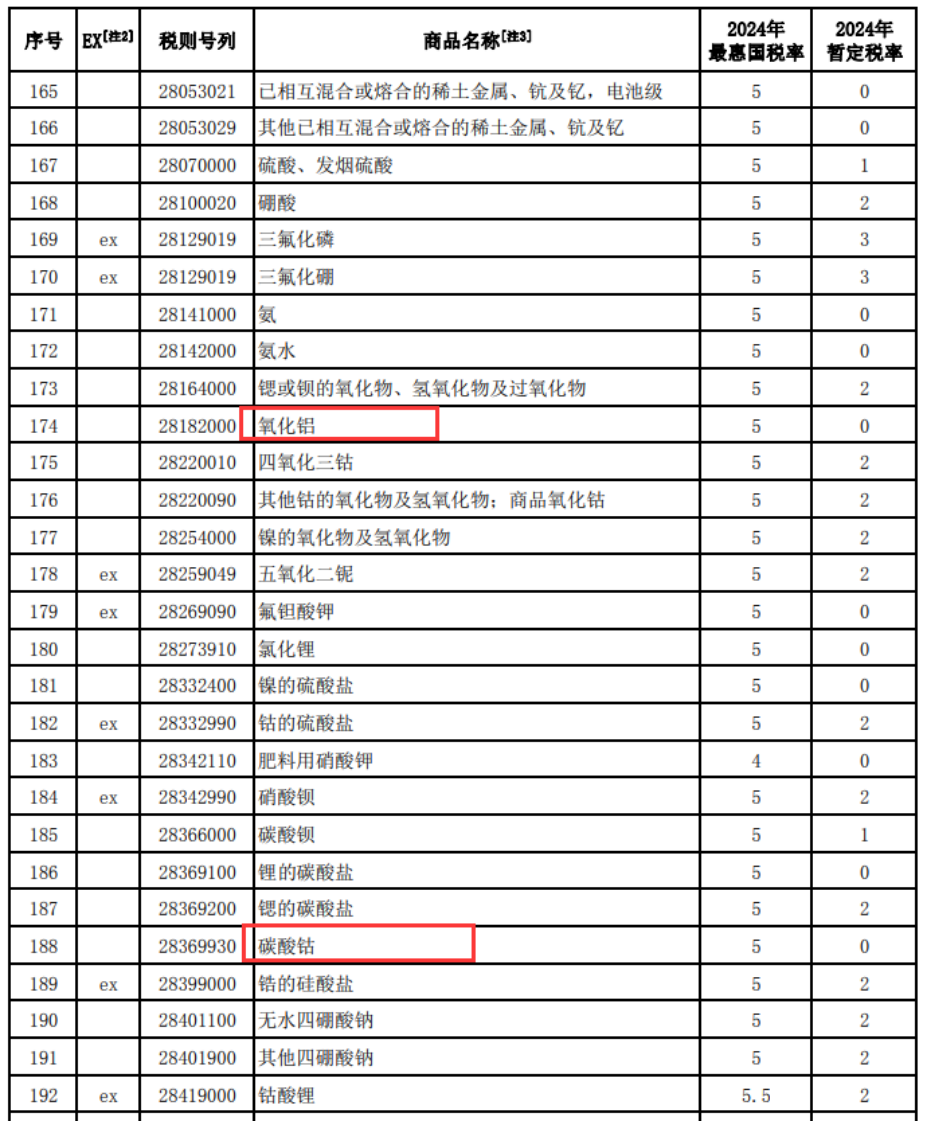 不仅如此,2024年将降低氯化锂、碳酸钴、低砷萤石等资源性商品的进口关税。其中,氯化锂、碳酸钴等商品是新能源汽车行业的关键原材料,萤石是战略性矿产资源,降低关税有助于支持企业在全球范围内配置资源,降低生产成本,提升产业链供应链的韧性。