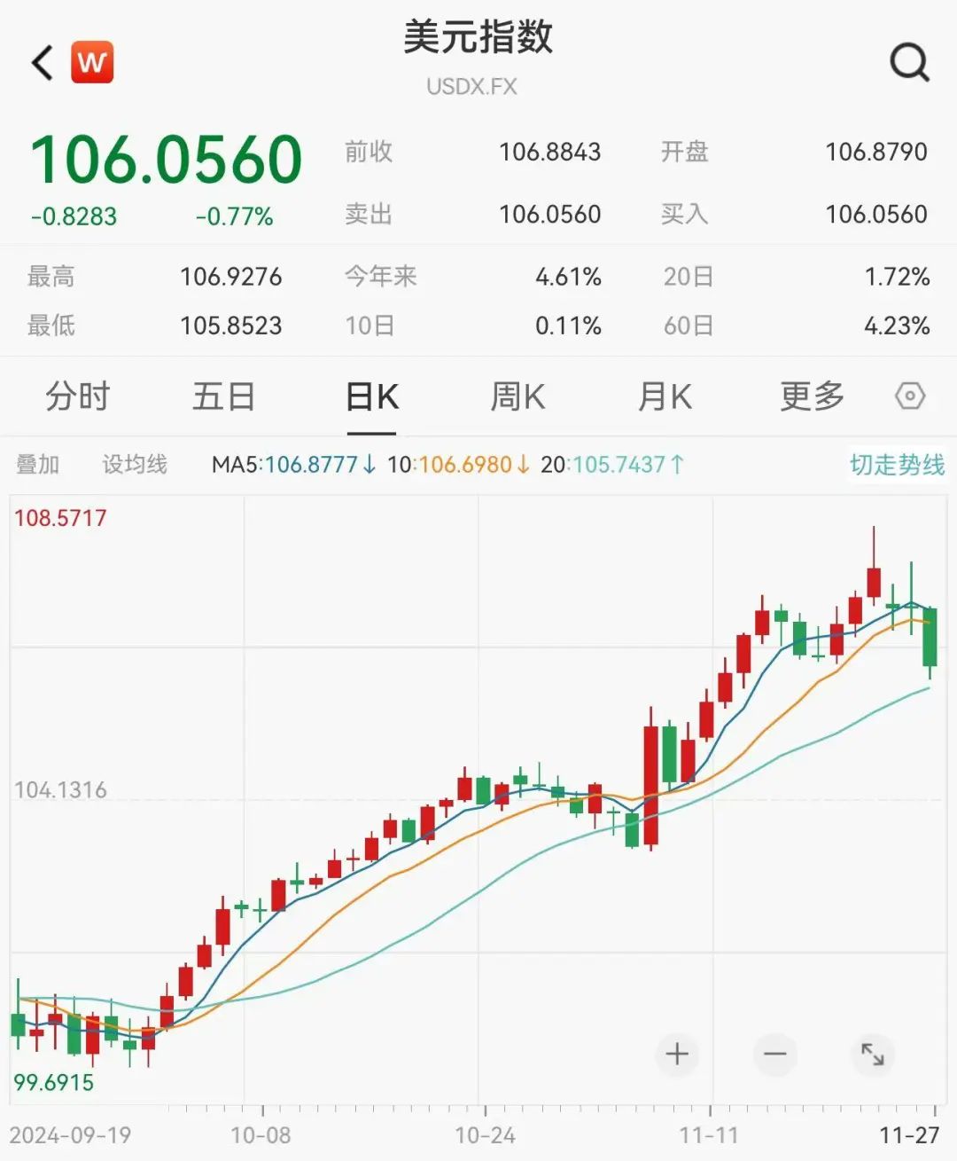 美元指数短线跳水,下跌近0.8%至106.06。
