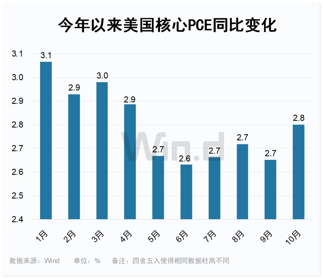 在此之前,最新的个人消费支出价格指数(PCE)公布,这是美联储青睐的通胀指标。PCE在10月份上涨0.2%,折合成年率上涨2.3%,符合预期。剔除食品和能源后,所谓的核心指数环比增长0.3%,同比增长2.8%,也符合普遍预期。